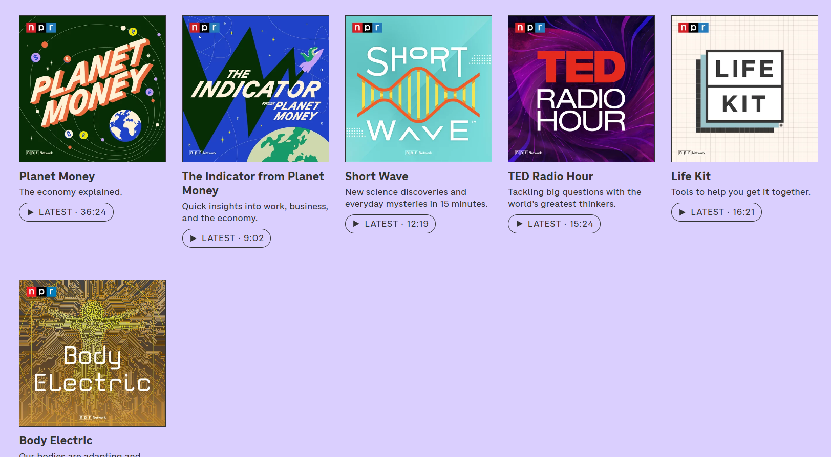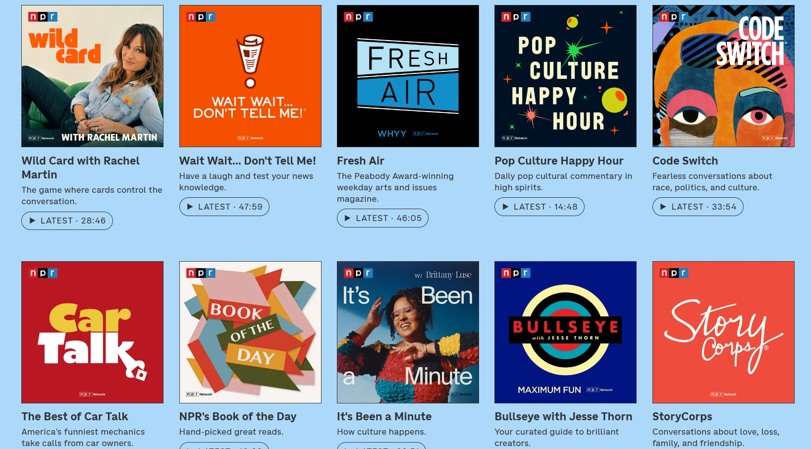 NPR's home to showcase all of the podcasts from the NPR family. You can listen to recent episodes of your favorite podcasts and subscribe using your app of choice. Looking for more great listens? Browse our entire catalogue by topic or, on each podcast's p