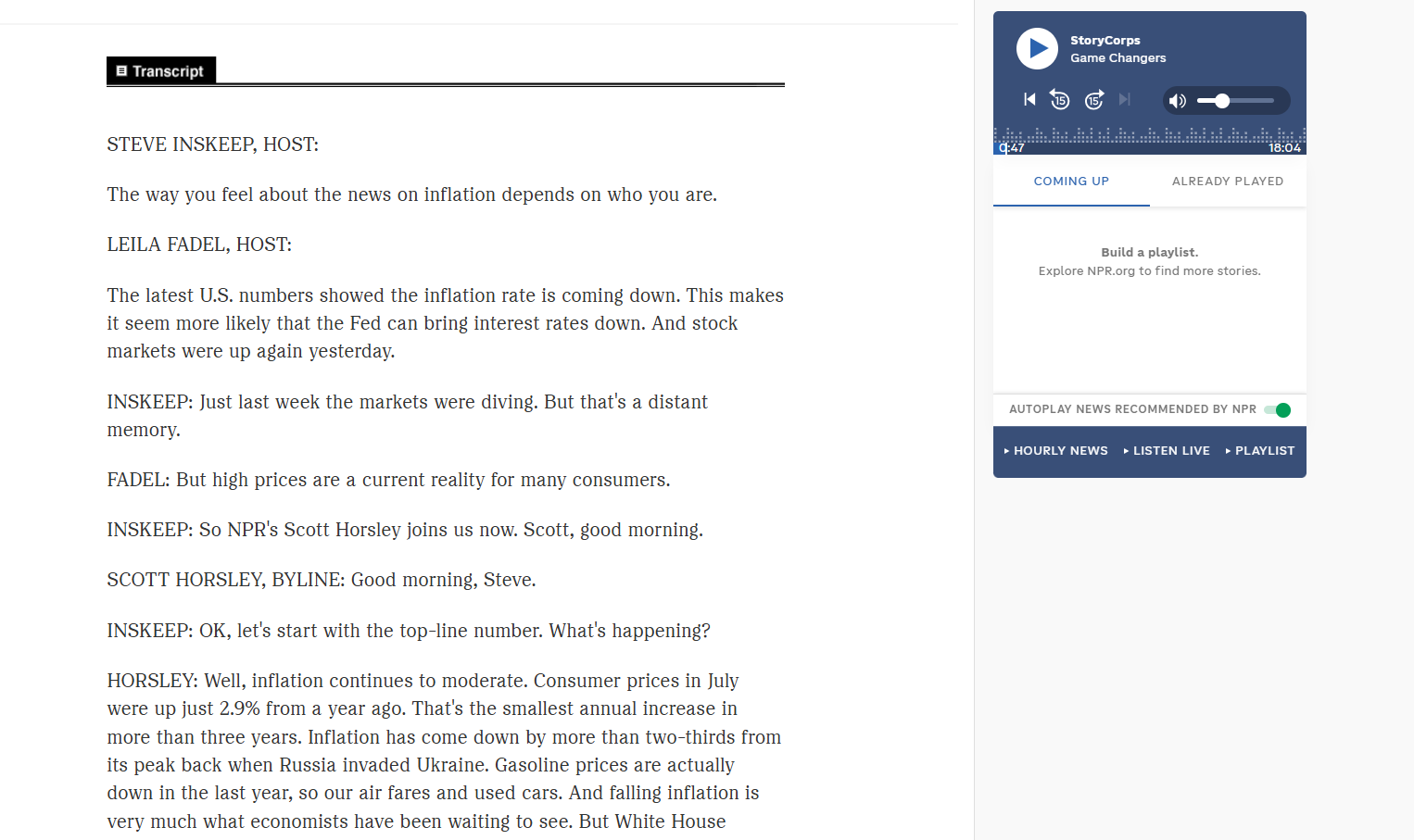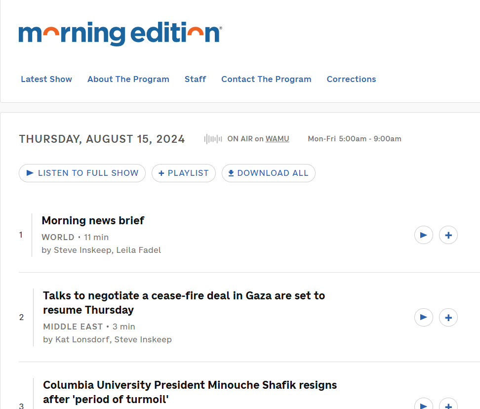 그 중에서 제가 즐겨 듣는 팟캐스트는 Morning edition입니다. 어제 내가 잠든 사이 무슨 일이 일어났는지 세계 정치, 경제, 문화를 영어로 들으면서 영어공부와 경제공부를 같이 하고 있어요. 특히 저처럼 미국주식을 하시는 분들은 미국의 경제지표 (PPI, CPI, 실업률과 실업수당 청구건수 등) 발표가 미국주식에 엄청난 영향을 미치기 때문에 이런 뉴스들을 꼭 알아야 예측 혹은 대응이 가능하실 텐데요. 그래서 저는 주로 아침에 일어나서 출근하기 전에 커피 한잔 하면서 혹은 차 안에서 Morning news brief를 듣고 있습니다. 보통 10-15분 정도로 짧게 중요한 뉴스만 요약해 줘서 부담 없이 듣기에 좋아요.