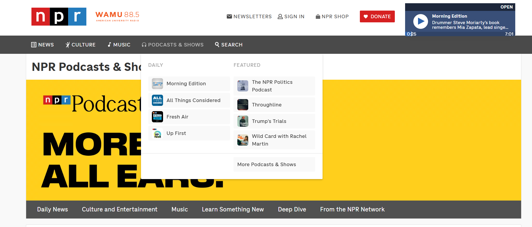 NPR(National Public Radio) 팟캐스트는 다양한 주제와 수준의 프로그램이 있어 자신의 관심사와 영어 실력에 맞는 콘텐츠를 쉽게 찾을 수 있다는 장점이 있습니다. 아래 사진에 보시는 것처럼 뉴스, 문화, 과학, 역사, 경제 등 여러 분야에 걸쳐 다양한 팟캐스트를 제공하기 때문에 본인의 관심사에 맞는 흥미 있는 주제를 선택해 더욱 재미있게 영어를 배울 수 있어요.