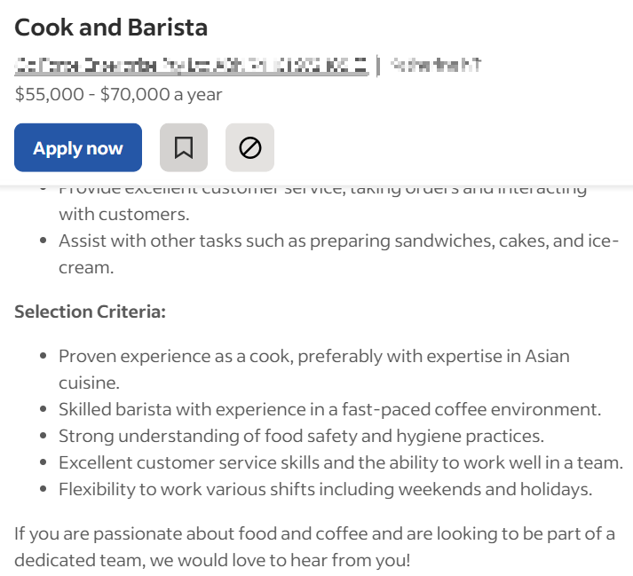 셰프와 바리스타를 구하는 기업의 구인광고 예시입니다.