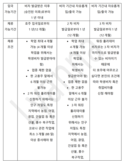 아래의 표는 퍼스트, 세컨, 써드 호주 워홀 비자의 자격요건, 신청비용, 신청기간, 입국가능기간, 체류가능기간, 체류조건을 나타낸 표입니다. 이 내용은 상시 변경가능하므로 아래의 호주 이민성 홈페이지에서 반드시 변경되거나 업데이트 된 내용이 없는지 확인하시길 바랍니다.