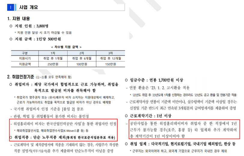 해외 취업에 성공한 청년들이 원활하게 현지에 적응하고 지속적으로 경력을 개발할 수 있도록 재정적으로 지원하는 제도로 1 인당 최대 500 만 원까지 지원받으실 수 있습니다. 저는 이런 제도를 나중에 영주권을 받고 나서 알게 되어 못 받았기 때문에 미리미리 찾아볼 걸 하는 후회가 남았습니다. 꼭 해외 취업 후 본인이 해당되는지 확인해 보시고 지원하시길 바랍니다. 매년 선착순으로 진행되고 아래에 나온 자격요건 이외에도 더 많은 절차와 기준조건이 있으니, 홈페이지에서 꼼꼼하게 읽어 보시고 해당된다면 꼭 지원받으셔서 초기 정착비로 사용하시기를 바랍니다.
