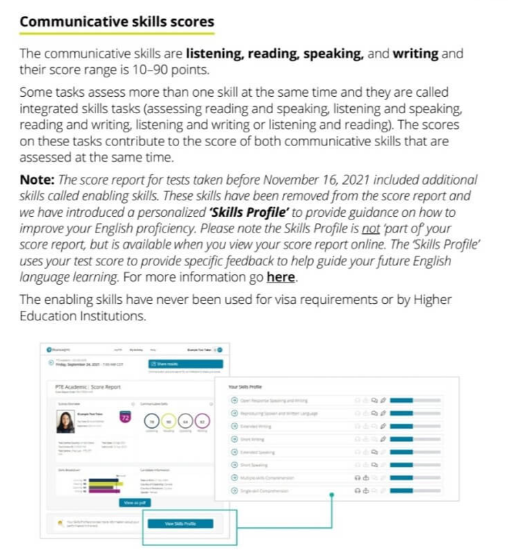 PTE시험은 시험결과의 점수와 함께 시험결과에 대한 피드백을 제공합니다. 내가 원하는 점수에 도달하지 못했을 때 이 피드백을 바탕으로 다음 시험을 보완할 수 있습니다. Pearson에서는 Skills Profile을 통해 응시자가 어떤 부분을 잘하고 부족한지에 대한 일련의 피드백을 제공합니다. 피드백은 총 8종류로 Open Response Speaking & Writing, Reproducing Spoken & Written language, Extended Writing, Short Writing, Extended Speaking, Short Speaking, Multiple Skills Comprehension, Single Skill Comprehension 입니다. 이 8가지 피드백을 통해 본인이 보완해야 할 부분을 알 수 있습니다. 예를 들어, Open Response Speaking & Writing은 주어진 문제에 내 의견을 말하고 쓰는 부분입니다. 즉, 주어진 문장을 그대로 읽는 Read Aloud나 들린 대로 말하는 Repeat sentence는 이 피드백에 포함이 되지 않습니다. 주어진 이미지나 그래프를 내가 해석해서 대답하는 스피킹 영역의 Describe Image 혹은 강의를 듣고 내가 요약해서 대답하는 Retell Lecture, 라이팅 영역에서는 주제에 맞는 내 의견을 서술하는 Essay 등이 해당됩니다. 이렇게 피드백을 통해 내가 더 집중해서 공부해야 할 문제유형들을 알고 다음시험에 보완하실 수 있습니다.