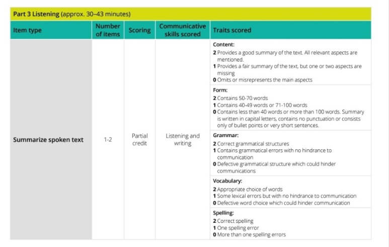 SST는 1-2개의 문항이 나오고 리스닝과 라이팅 점수에 반영되어 채점됩니다. 스피킹 파트의 Retell Lecture가 강의를 듣고 요약해서 다시 말하는 문항이었다면, SST는 강의를 듣고 요약해서 쓰는 문제입니다. RL에서처럼 빠르게 들리는 단어를 본인이 알아볼수 있게 적고 나중에 정리해서 템플릿에 키워드를 넣으시면 됩니다. 최대한 빠르게 많은 단어를 적어야 하기 때문에, 저는 영어와 한국어를 섞어서 내가 알아볼 수 있게 빨리 적어서 노트테이킹을 했습니다. 본인에게 맞는 방법이 다 다르니 연습을 많이 해보시고 잘 맞는 방법으로 빠르게 최대한 많이 노트테이킹을 해주시면 됩니다. Content, Form, Grammar 그리고 Vocabulary를 바탕으로 채점이 됩니다. 자세히 하나하나 살펴보겠습니다.